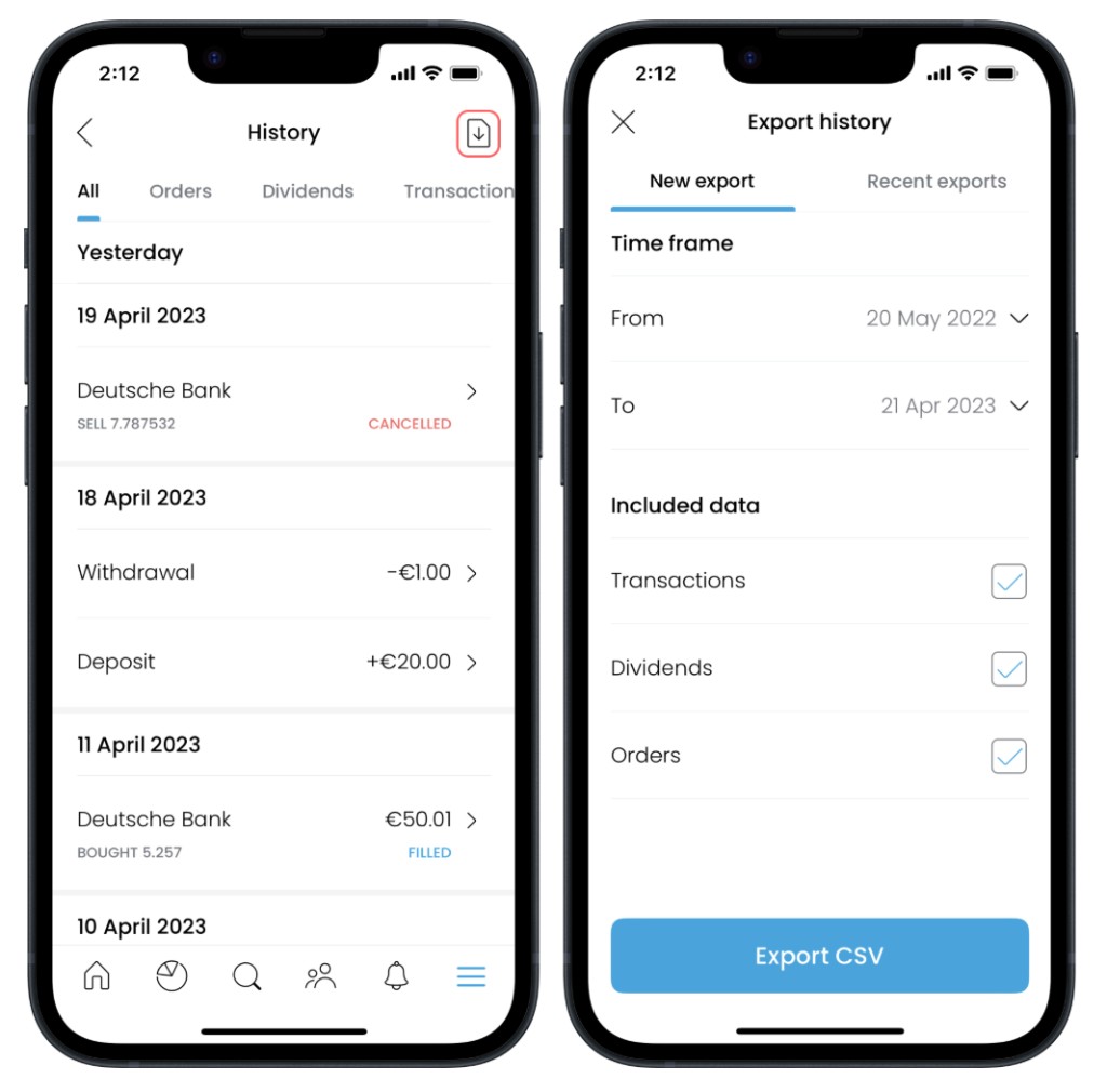 - Choose your timeframe and what you want to export (orders, transactions, dividends, etc.)
